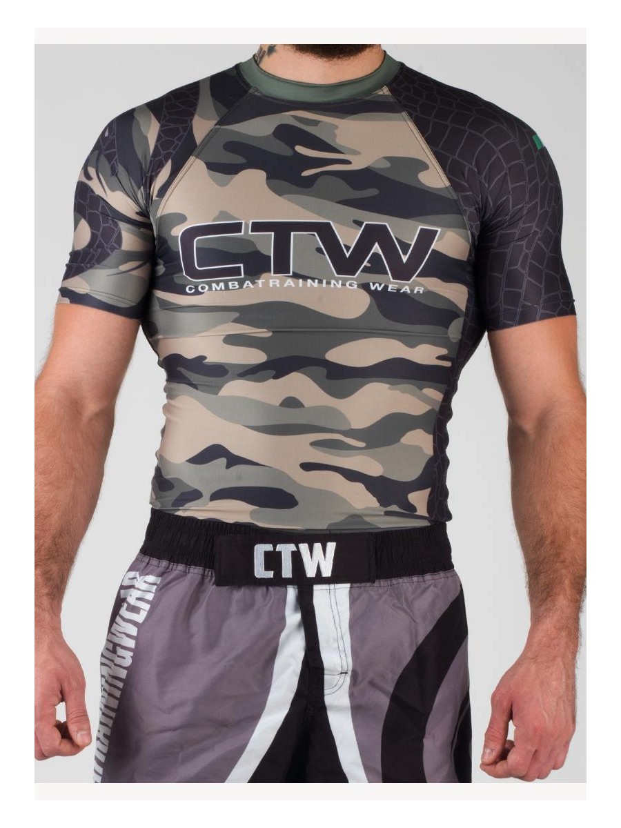 La Rashguard a maniche corte CTW è una t-shirt tecnica adatta ad allenamenti intensi. Il tessuto elasticizzato con cui è realizzata è traspirante e a compressione, ovvero permette al sangue di ricevere maggior ossigeno durante gli allenamenti. Asseconda i naturali movimenti del corpo, con cuciture piatte e rinforzate e un`ottima aderenza al busto.Sstampe sublimate e resistenti nel tempo.Ottima per allenamenti di arti marziali miste e BJJ