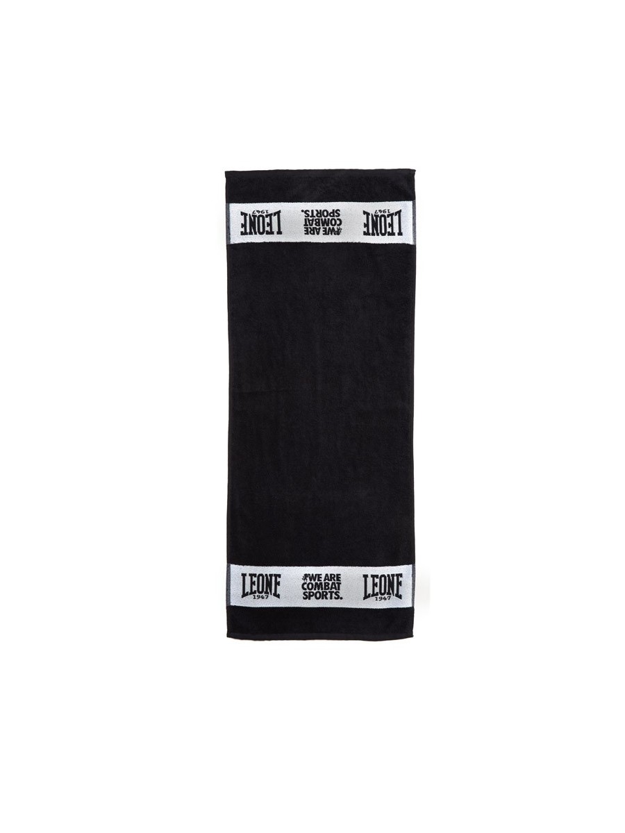 Asciugamano in spugna adatto come telo panca durante gli allenamenti in palestra o come asciugamano da ring. Realizzato in colore nero con bordi bianchi jacquard brandizzati con logo e pay off di Leone 1947. Altezza: 100 cm Larghezza: 40 cm"