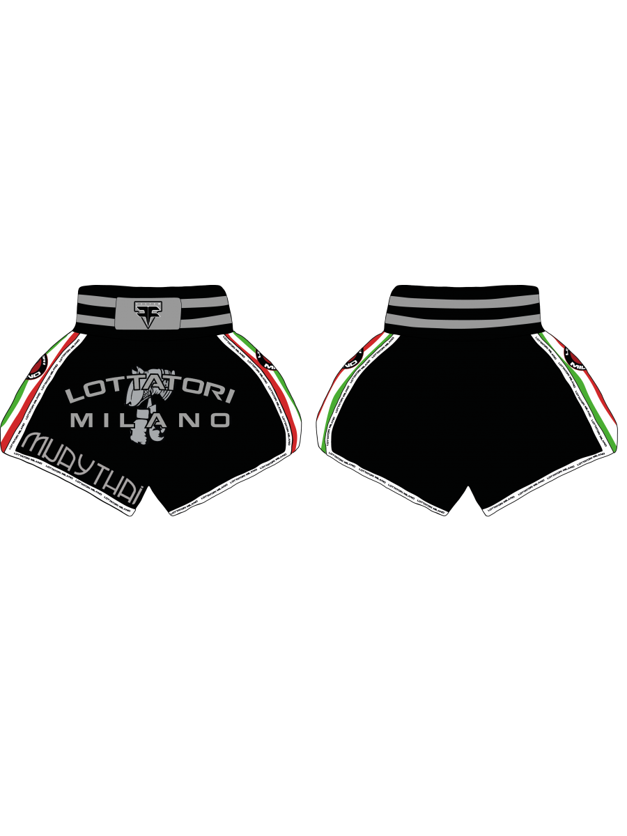Pantaloncino da combattimento e da allenamento personalizzato Lottatori MIlano , caratterizzato da alta fascia elastica in vita e spacco per concedere la massima libertà di movimento