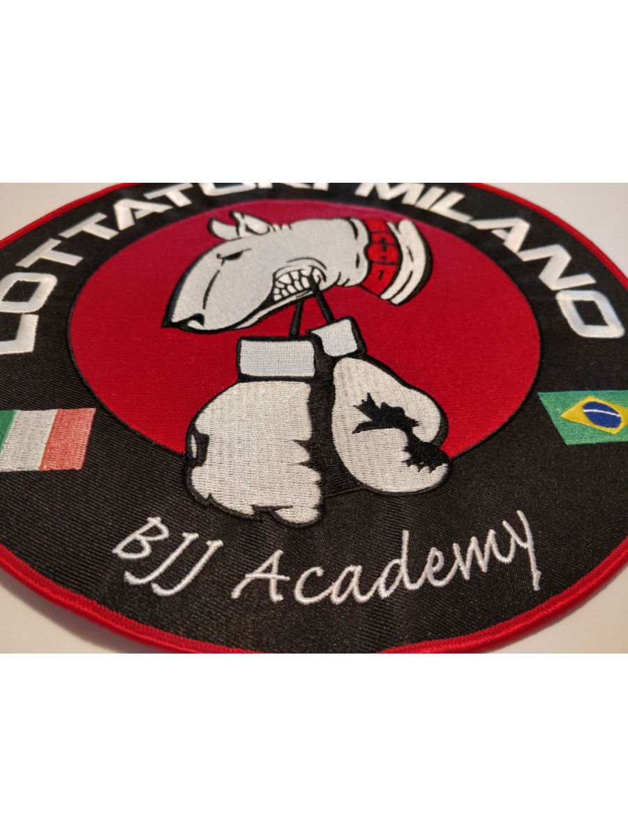 Toppa termoadesiva ricamata con Logo Lottatori MIlano e Brazilian Jiu-Jitsu Academy grande .Grande,ideale da applicare sulla schiena per personalizzare il tuo kimono o i tuoi accessori.